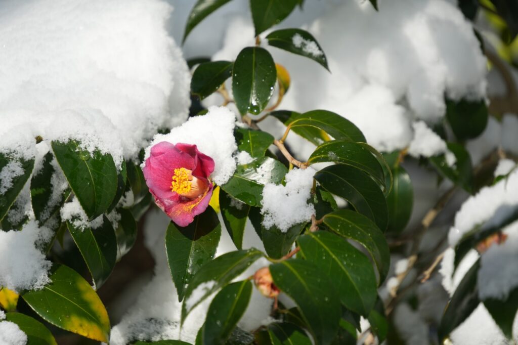 雪が積もっても「ヤブツバキ」はしっかり咲いていたとのこと。