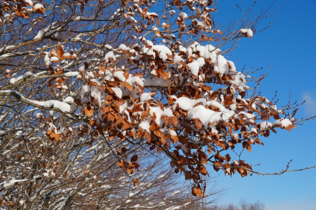 「幸運しおり 落ちない葉」に使っている「ヤマコウバシ」も、雪が積もっても落ちずに葉が残っていました。