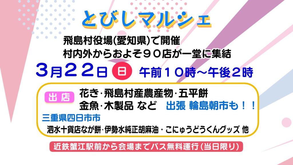 3月22日 日曜日に、愛知県の飛鳥村でマルシェが開かれます。