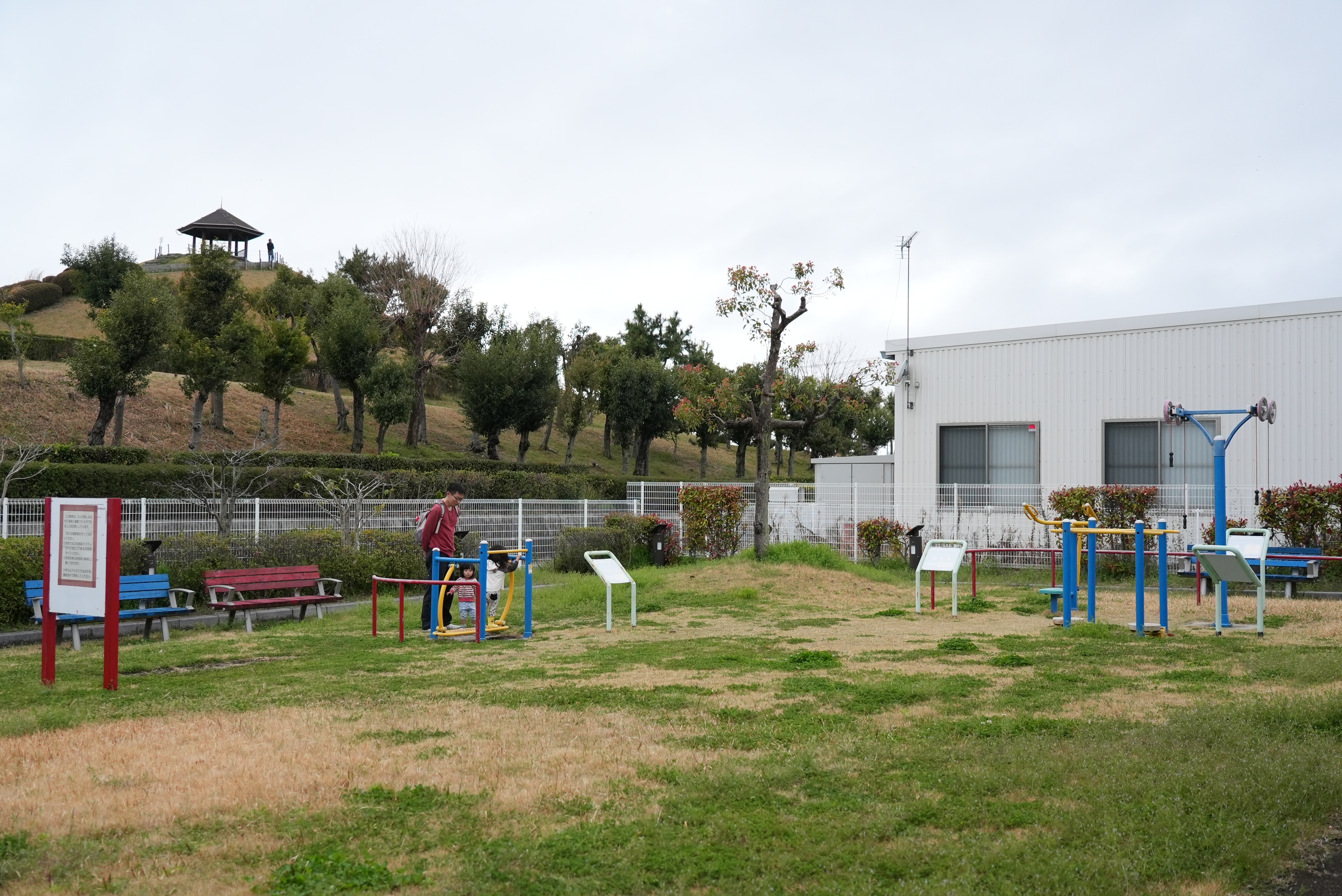 屋外健康器具が設置された芝生広場です。