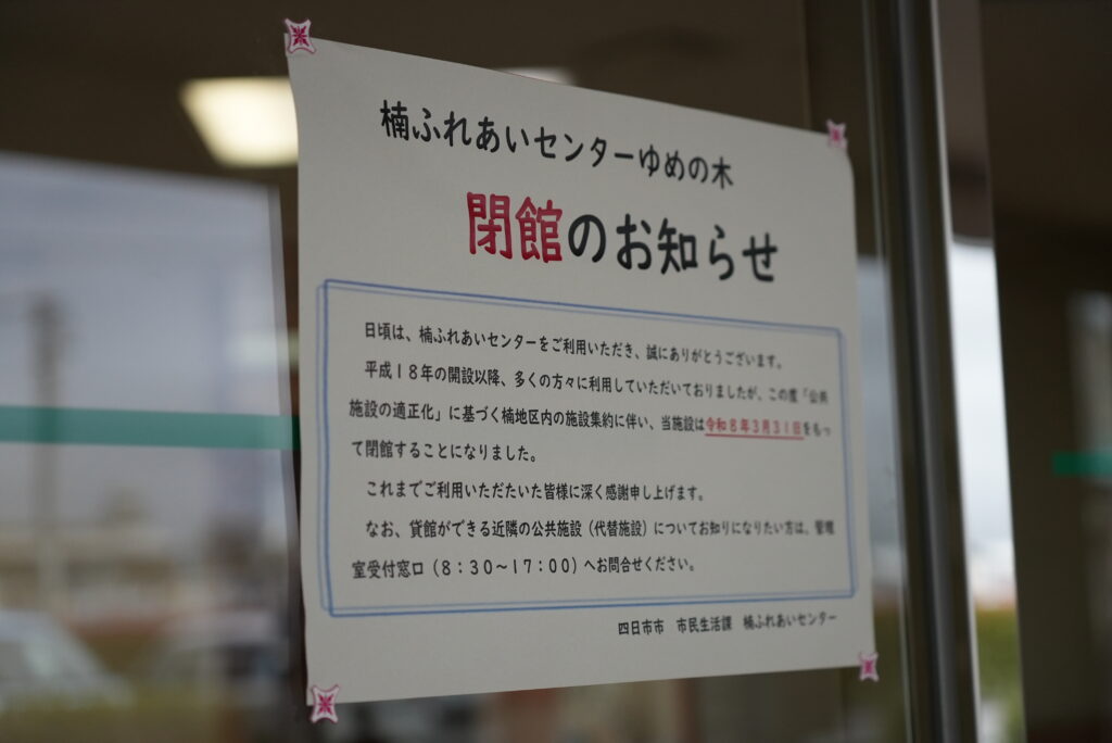 「公共施設の適正化」に基づく楠地区内の施設集約に伴い 今日3月31日に閉館しました。